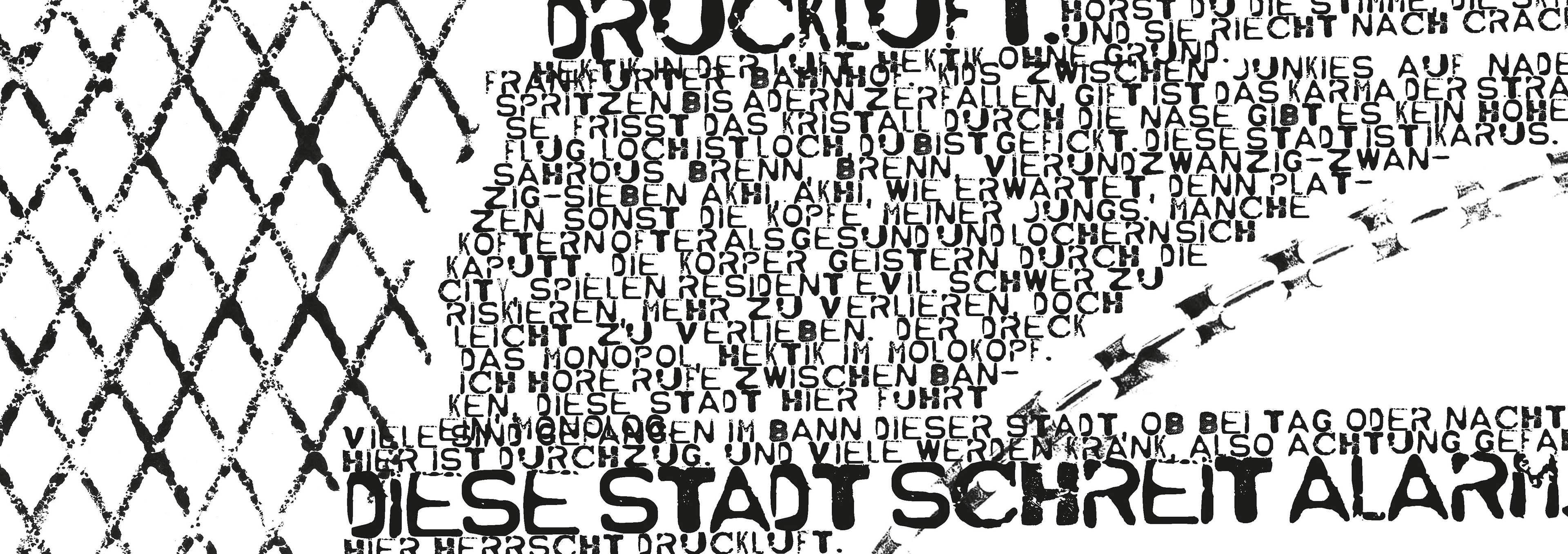 Auf Gullideckeln, Betonsockeln, Schildern etc. habe ich Gravuren gefunden, die ich auf Papier übertragen konnte. Anschließend habe ich mit der Schrift den Songtext zu „Druckluft“ des Frankfurter Rappers Credibil gesetzt und so den Bogen wieder zurück zum Thema Straße gespannt.